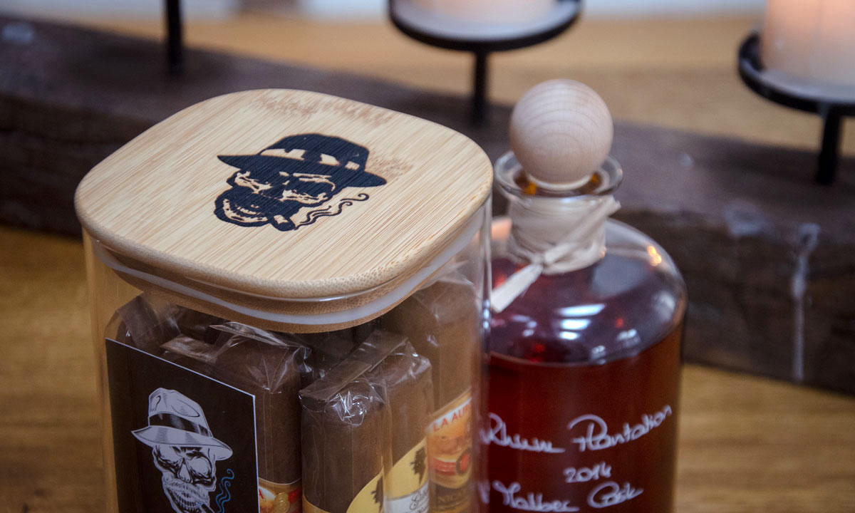 Finden Sie eine Auswahl unserer Lieblingsgläser in einem gravierten Blue Smoke Spirit Humidor.