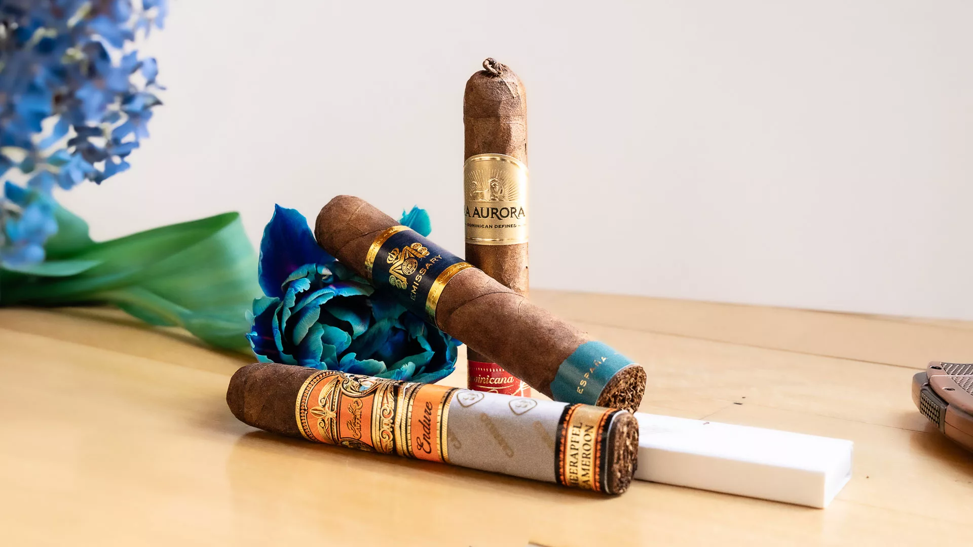 L’E. P. Carrillo Endure Robusto, habillé d’une cape Meerapfel du Cameroun et d’un assemblage nicaraguayen, dévoile une belle richesse aromatique où douceur, puissance et complexité s’harmonisent parfaitement. À ses côtés, La Aurora Dominicana Short Robusto, petit puro dominicain, surprend par son intensité, offrant des notes grillées, boisées et terreuses dans un format compact. Enfin, le Macanudo Emissary España, issu d’un assemblage de tabacs provenant de cinq pays dont un rare tabac cultivé en Espagne, séduit par son profil léger et élégant, marqué par de délicates notes douces et d’amandes.