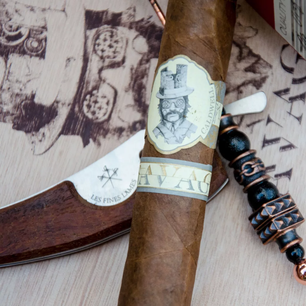 La feuille de cape Habano à la couleur caramel est sertie d’une bague au look steampunk conçue par l’artiste turinois Pixel Pancho. On retrouve ici un côté décalé qui s’inscrit parfaitement dans la lignée de la gamme « The Special Stuff » produite par Robert Caldwell et son équipe.