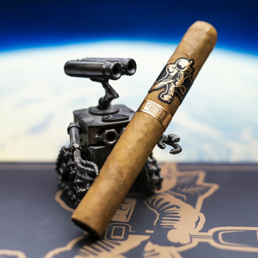 Le nom “Johnny Tobacconaut” est un clin d’œil astucieux, fusionnant tobacco (tabac) et astronaut (astronaute). L’astronaute sur l’anneau devient alors le symbole parfait de cet explorateur du goût, un voyageur intergalactique du tabac. Matt Booth, créateur de Room 101, le décrit d’ailleurs comme “l’astronaute qui marche à travers la galaxie avec un sac de feuilles de tabac sur le dos”.