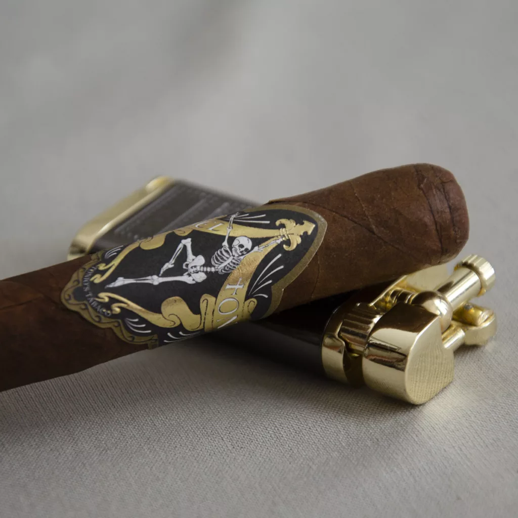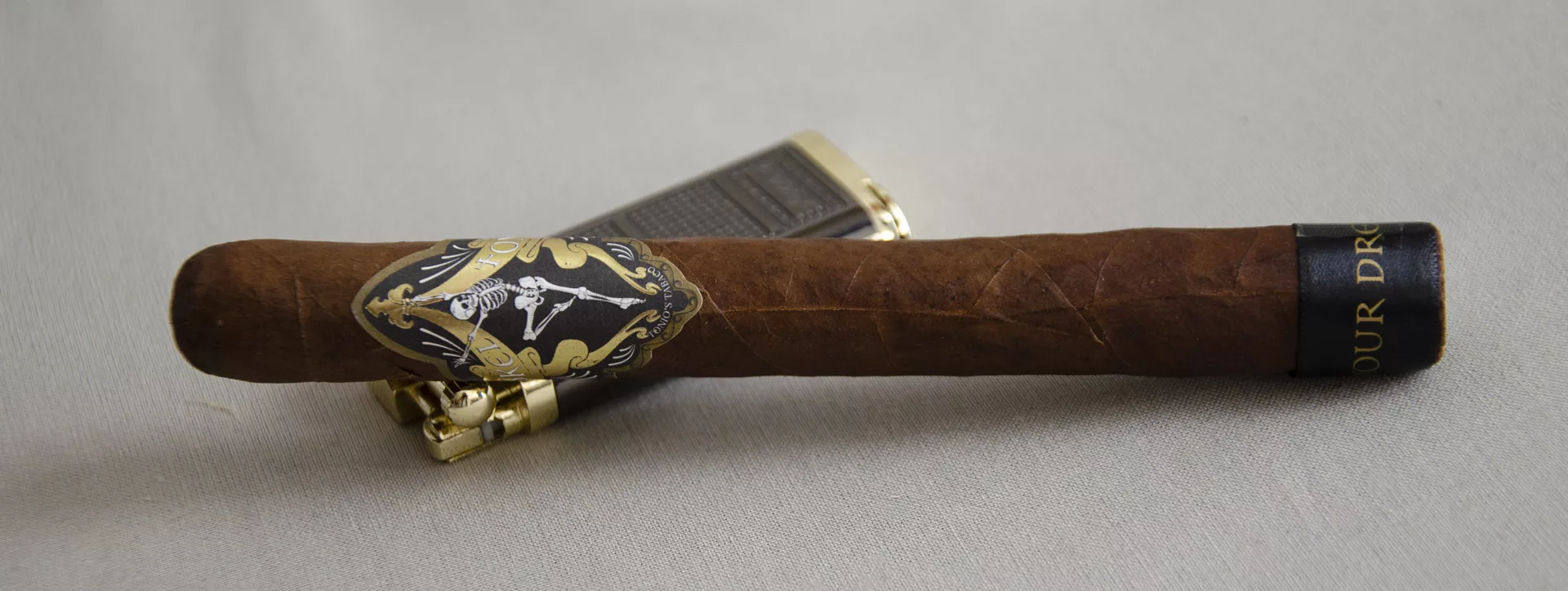 La cape d’Equateur sombre sertie d’une bague arborant fièrement un squelette dansant donne un côté sombre et envoutant à la vitole. La tripe est composée de tabacs de République Dominicaine, Nicaragua et Honduras. Ils apporteront des saveurs douces de cacao. La sous-cape (ou les sous-capes dans ce cas) est composée de feuilles du Nicaragua et d’Indonésie. C’est peut-être cette dernière qui nous apportera son côté torréfié.