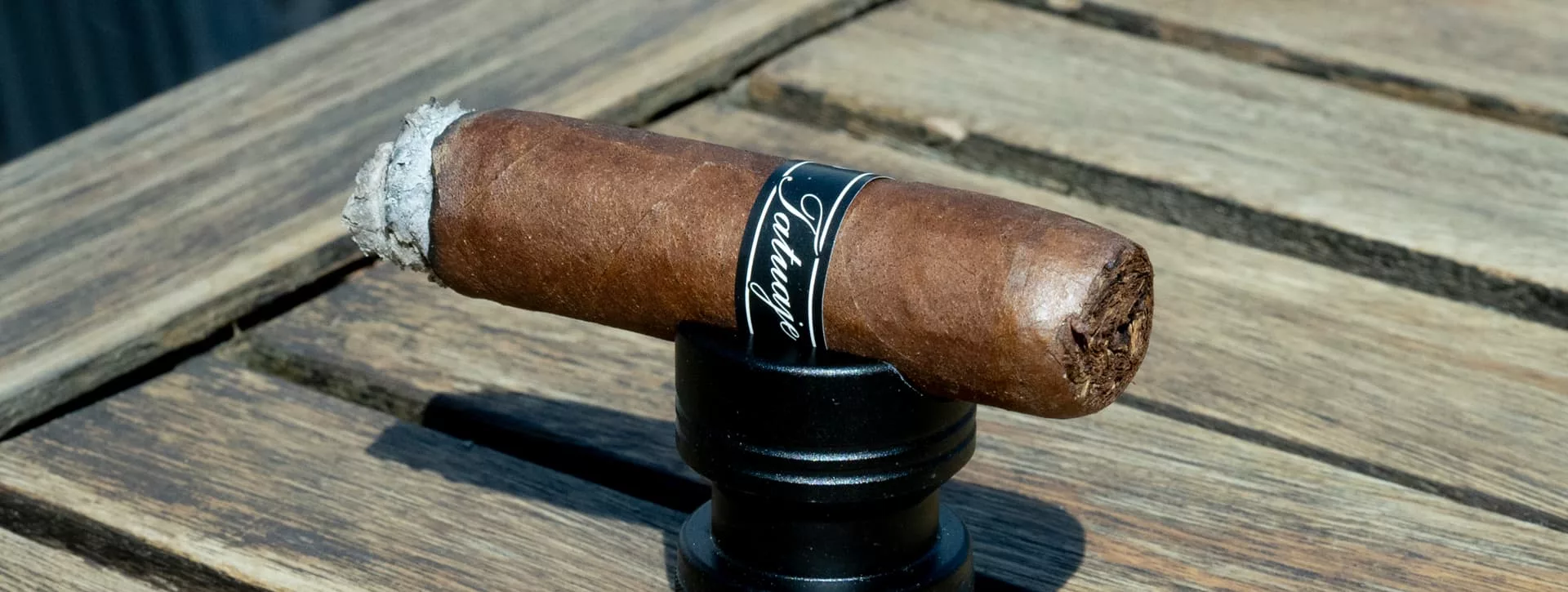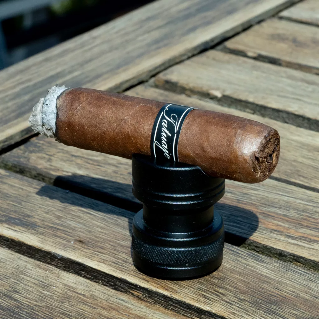 Sobre et efficace, le Tatuaje Black Label Petit Robusto séduit par son allure discrète. Sa courte taille de 4 x 50 s’habille d’une cape bien tendue aux reflets huileux, parcourue de fines veines perceptibles sans excès. Une simple bague fine, posée à la tête, lui confère un aspect strict et minimaliste, parfaitement en accord avec son identité. Le design, simple et sans fioriture, annonce déjà le ton : celui d’un cigare qui mise sur la substance plus que sur l’apparat.