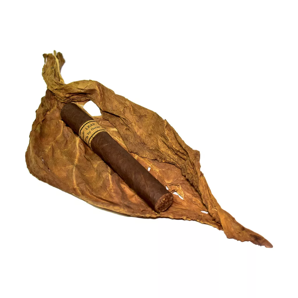 C’est comme notre premier cadeau de Noël: une feuille de tabac, soigneusement roulée, remplace le cellophane et nous réserve un réel cadeau cigaresque : The Leaf Oscar Valladares Maduro. C’est Oscar lui-même qui a eu cette idée ingénieuse, par souci écologique et pour un clin d’oeil à la culture Maya : « L’idée du cigare enveloppé dans une feuille lâche évoquait les premiers cigares des Mayas, qui roulaient simplement des feuilles de tabac pour les fumer. »